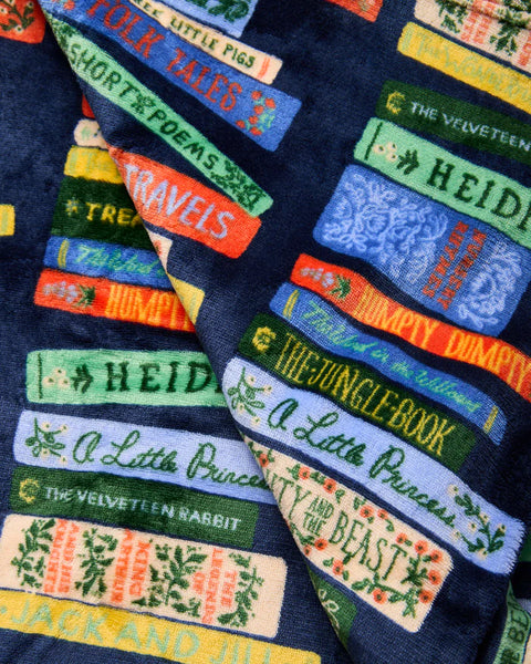 Curl up with a good book and our bookshelf fleece blanket, featuring a line up of our favorite classic titles. Made of plush fleece, the blanket comes packaged with a ribbon so it’s ready to gift.