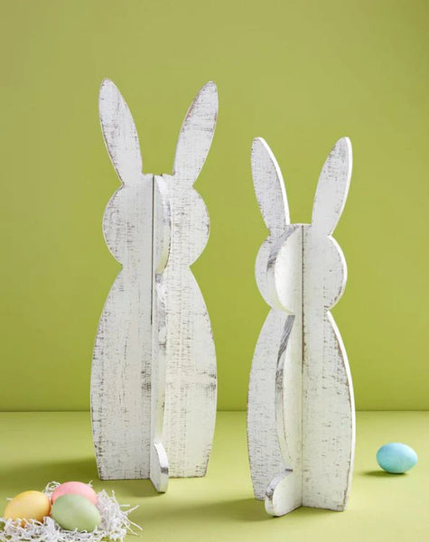 This white-washed wooden bunny sitter is a charming addition to your home decor. Made from pine wood, it has a rustic and natural look.