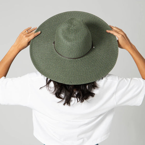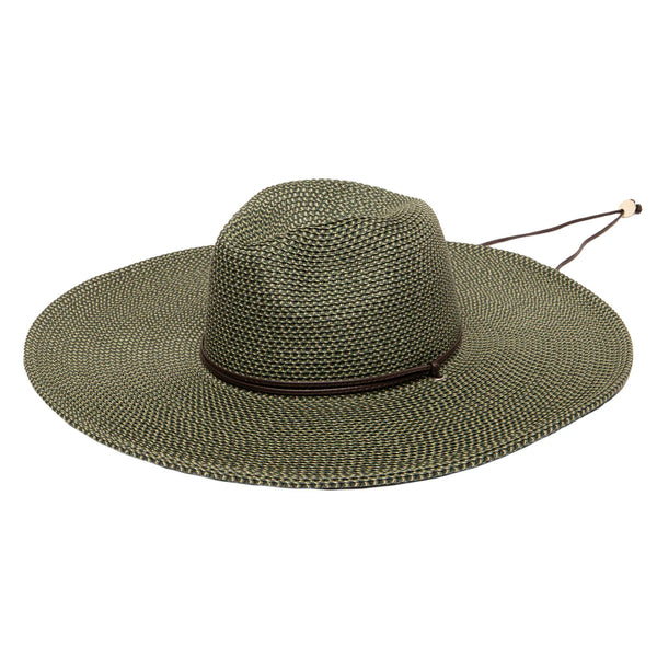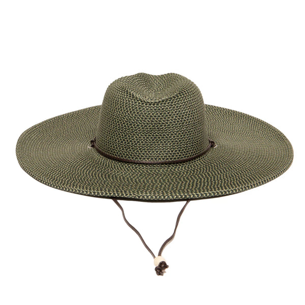 This hat features a pinched crown with a large brim perfect for keeping the sun off of your face! Features an inner stretch band and chin cord to help stay in place.