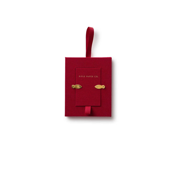 Hang a family photo or a favorite memory on this year’s tree. This bookcloth-wrapped frame features delicate embroidery and a grosgrain ribbon loop.