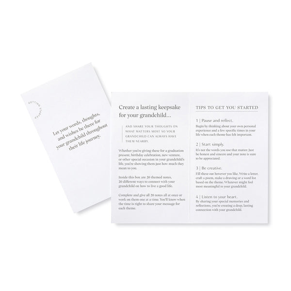 Share your thoughts and wishes with your grandchild and deepen the bond between you. Inside this box are 20 themed notes for you to write. Complete each one with your reflections on topics such as falling in love, family, friendship, and bravery. When you’re done, you’ll create a treasure trove of wisdom, filled with life experiences and love.