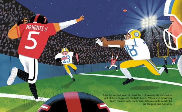 Little Patrick grew up in Texas. His dad was a legendary baseball player and he dreamt of following in his footsteps. As a child, he excelled at all sorts of sports: from baseball to basketball to ping-pong, but it was American football which captured his heart. In college, he dedicated himself to building his skills and strength on the field. His hard work soon paid off when he was asked to join the Kansas City Chiefs. Just two years later he won his first super bowl ring! The next few years bought two more Superbowl victories as well as some losses. But whether he wins or loses, Patrick knows that the most important thing is being a good teammate and a strong leader.
