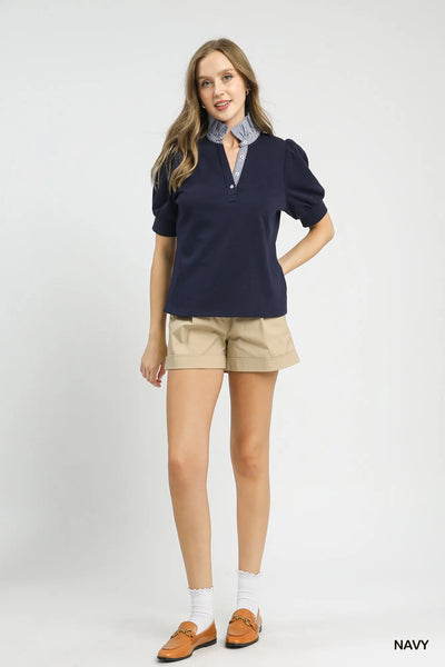 This High Ruffle Neck Top is modeled after the classic preppy polo style, but has a pretty striped neckline and raised seam on the back.