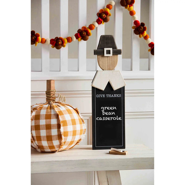 Our delightful Pilgrim Chalkboard Decor is the perfect addition to your Thanksgiving celebration. This charming two-piece set includes a high-quality wooden chalkboard featuring a festive pilgrim design. Standing elegantly on its easel, this pilgrim chalkboard is both functional and decorative. To inspire creativity, we also provide a convenient three-pack of chalk. The front of the chalkboard proudly displays the heartfelt sentiment "Give thanks". With its compact size of 6 1/2" x 22 1/2", this versatile chalkboard can be easily placed anywhere in your home. Get ready to express gratitude and create a warm and inviting atmosphere with our Pilgrim Chalkboard Decor.